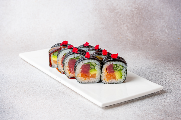 Лосось , червона тобіка , вершковий сир Філадельфія , пікантний соус ширачі, рис , норі, імбир, унагі, майонез , авокадо, подається з соусом унагі.