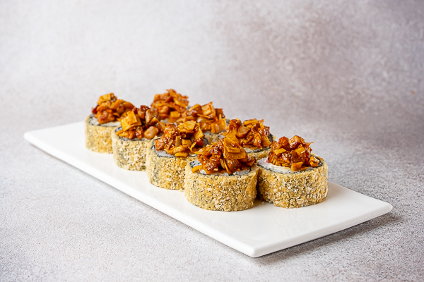 Тунець, лосось, вершковий сир Філадельфія, огірок, цибуля зелена, норі, рис в темпурному клярі та сухарях панко.
