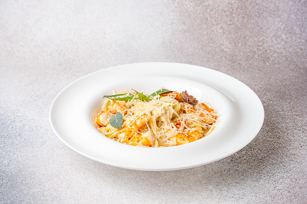 Спагетті, тигрові креветки, вершковий соус, соус горіховий, пармезан, базилік, сіль, перець.