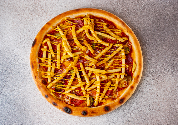 Соус з цілих томатів пелатті, моцарела, салямі, бекон, маринований огірок, цибуля червона, картопля фрі, американська гірчиця.