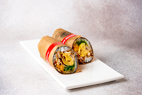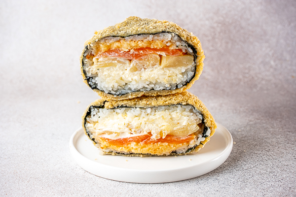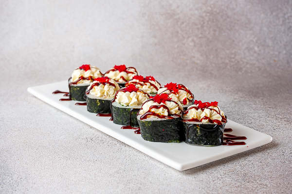 Рис, норі, червона тобіка, вершковий сир, смажений лосось, огірок, соус спайс, японський омлет, кляр, сухарі панко, унагі соус.