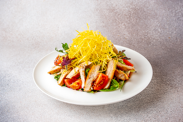 Мікс салату, куряче філе гриль, огірок, чері, червона цибуля, соус на основі оливкової олії, кортопляний пай.