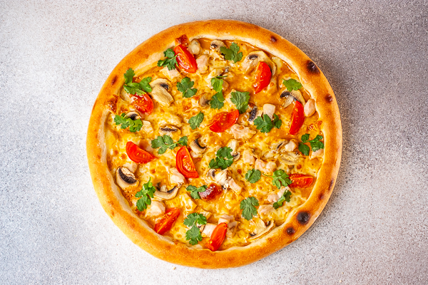 Вершковий соус, печериці, моцарела, бекон, куряче філе, червона цибуля, соус барбекю.