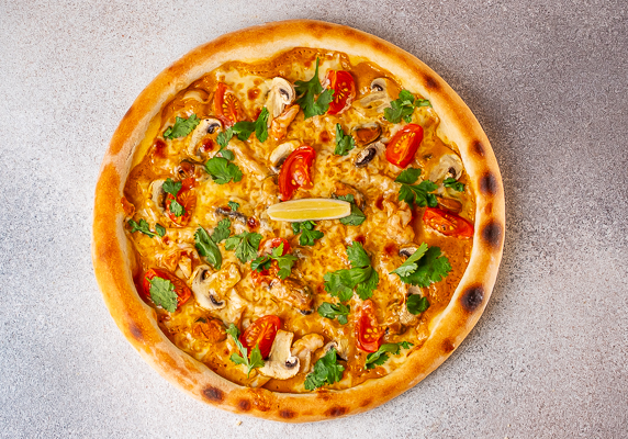 Пікантний Том Ям соус 🌶️, моцарелла,куряче філе, печериці, чері, кінза