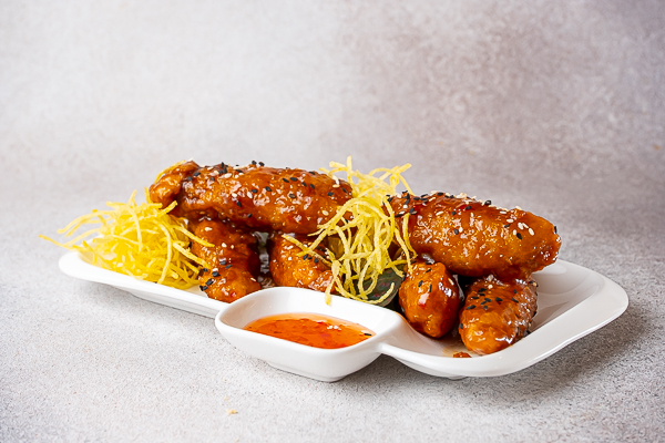 Куряче філе, кляр, соус вок, соус світ чілі, картопляний пай.