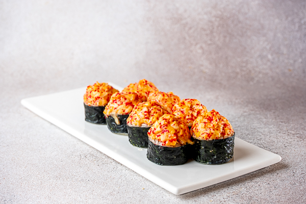 Сніговий краб , Спайсі соус , вершковий сир, помідор , норі , рис в темпурному клярі і сухарях Панко.