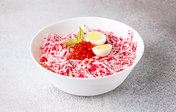 Сніговий краб, авокадо, огірок, кукурудза, майонез, тобіка червона, яйце перепелинне, ікра червона, рис, соус від шефа