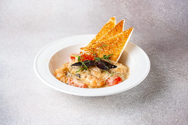 Цибуля ріпчата, креветка тигрова, кальмар, мідія, восьминіг, гребінець, тим'ян, біле сухе вино, соєвий соус, устричний соус,вершковий соус, пармезан, чері, чеврона ікра, хліб.