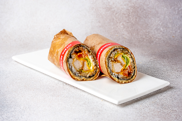 Куряче філе в темпурному клярі та сухарях панко, вершкий сир Філадельфія, сир чеддер, соус цезар, айсберг, помідор,норі, рис, кляр, сухарі Панко. Подається з соусом унагі.