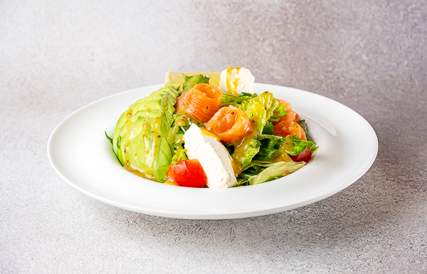 Мікс салату, малосольний лосось, авокадо, Вершковий сир Філадельфія, соус дресінг ( медово-гірчичний), чері, лимон.