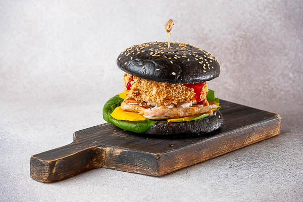 Смачна булочка, куряче філе гриль, моцарелла в темпурному клярі, манго, соус світ чілі, шпинат, базилік, фета, соус ягідний.