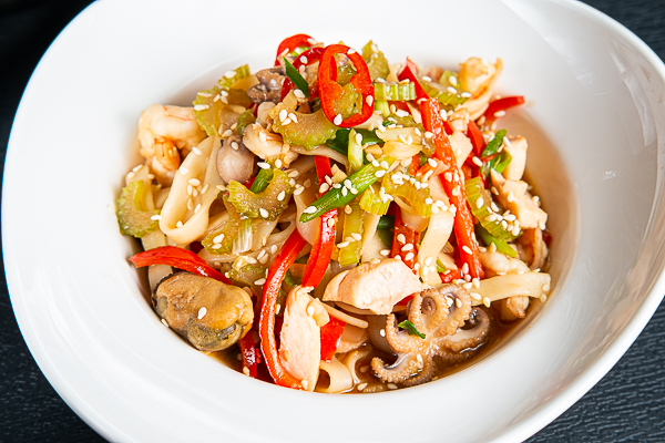 Локшина Удон, лосось, тигрові креветки, мідії, восьминіг, болгарський перець, селера, цибуля порей, імбір, устричний соус, соевий соус