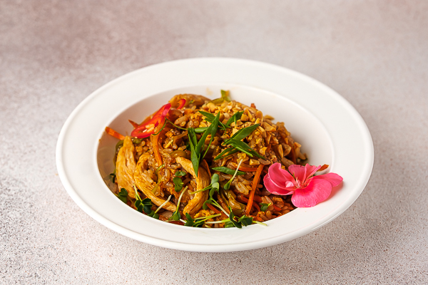 Локшина Удон, ніжна курочка, морква, кабачок, чилі перець 🌶️, цибуля порей, арахіс, зелена цибуля, імбір, соевий соус, мед.