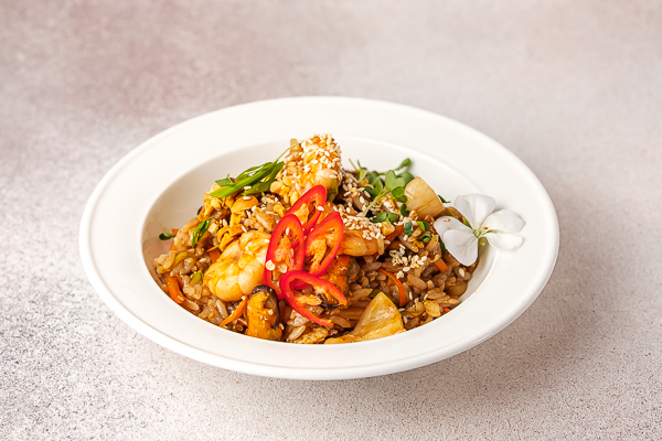 Рис, морепродукти, морква, кабачок, цибуля порей, яйце, соус від шефа, шрирача, часник, кунжутна олія, арахіс, зелена цибуля, кунжут, чилі перець.