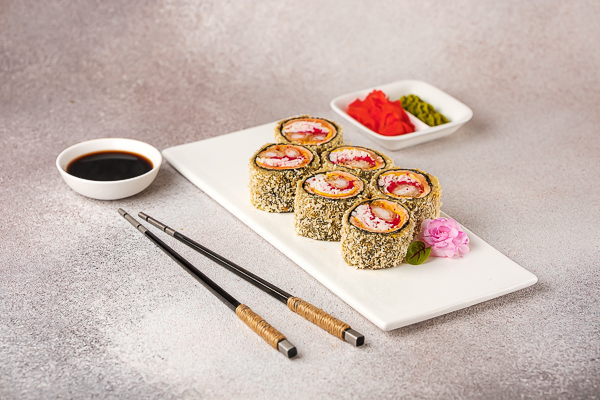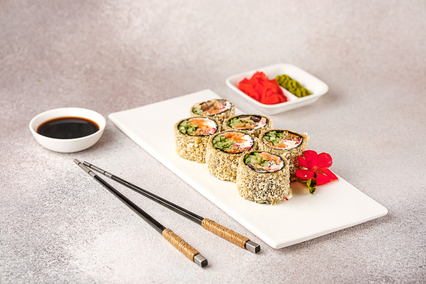 Лосось, тигрова креветка, огірок, вершковий сир Філадельфія, рис, норі, соус унагі, мигдалева стружка, в темпурному клярі та сухарях панко