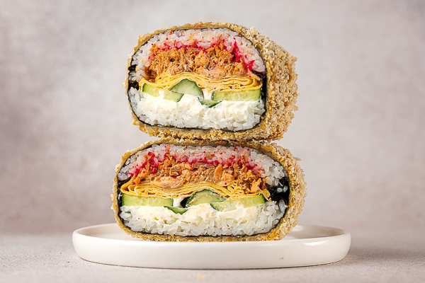 Рис, норі, червона тобіка, вершковий сир, смажений лосось, огірок, соус спайс, японський омлет, кляр, сухарі панко, унагі соус.