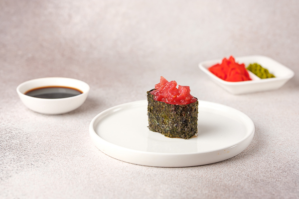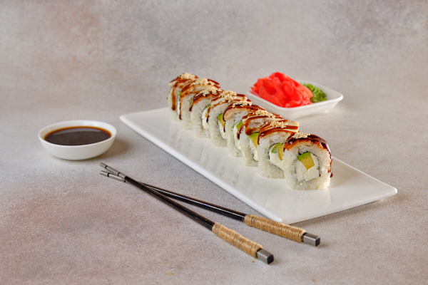 Креветки Темпура, чука, рис, норі, імбир, унагі соус, майонез, огірок, вершковий сир Філадельфія, подається з соусом унагі.