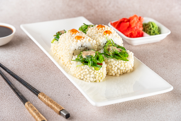 Лосось, тигрові креветки темпура,вершковий сир Філадельфія, авокадо, огірок, рисові кульки, норі.