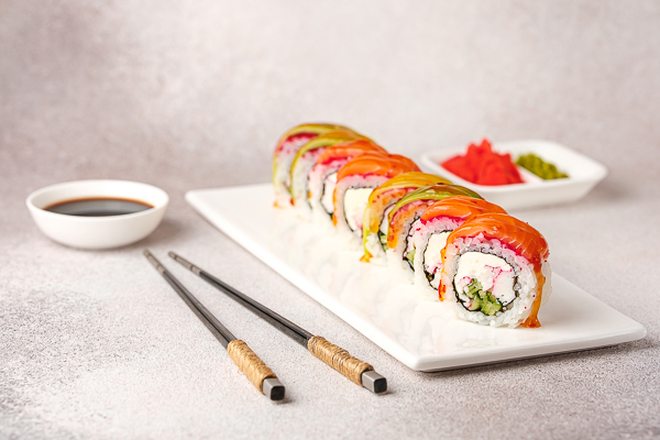 Лосось, вугор, огірок, вершковий соус , соус солодкий чилі, норі,рис