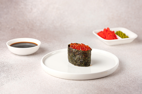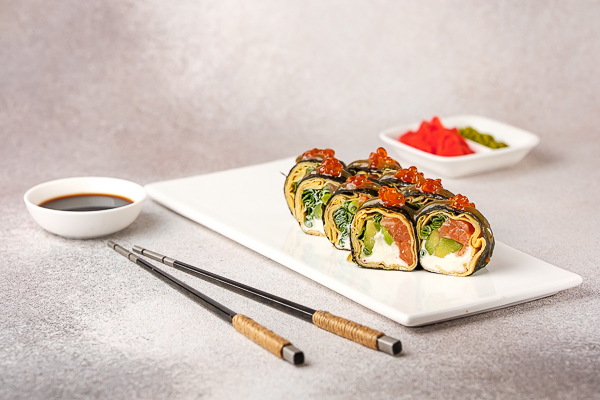 Норі, омлет, вершковий сир , лосось, авокадо, зелена цибуля, соус медово-гірчичний, ікра червона