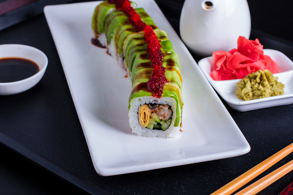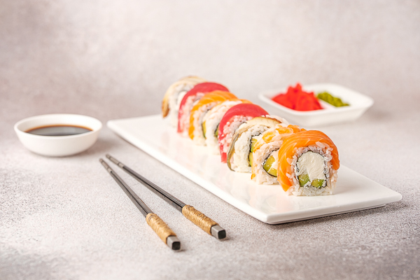 Лосось , червона тобіка , вершковий сир Філадельфія , пікантний соус ширачі, рис , норі, імбир, унагі, майонез , авокадо, подається з соусом унагі.