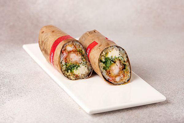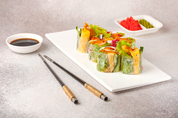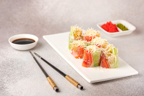 Рисовий папір, креветка в темпурі, латук, огірок, вершковий сир, тобіка червона, омлет, світ чилі.