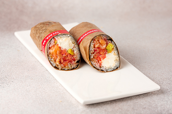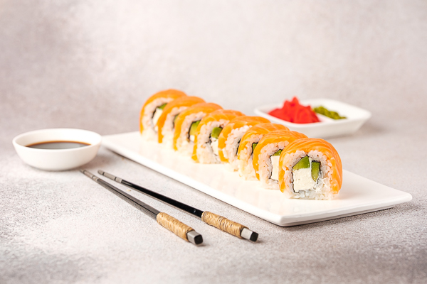 Лосось, тигрова креветка, вершковий сир Філадельфія, норі, рис, манговий соус , мигдалева стружка.