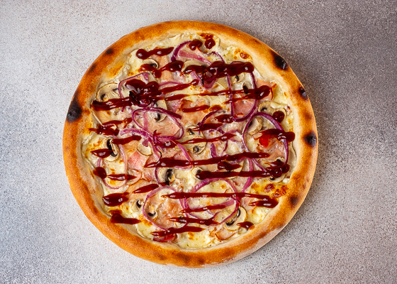 Вершковий соус, печериці, моцарела, бекон, куряче філе, червона цибуля, соус барбекю.