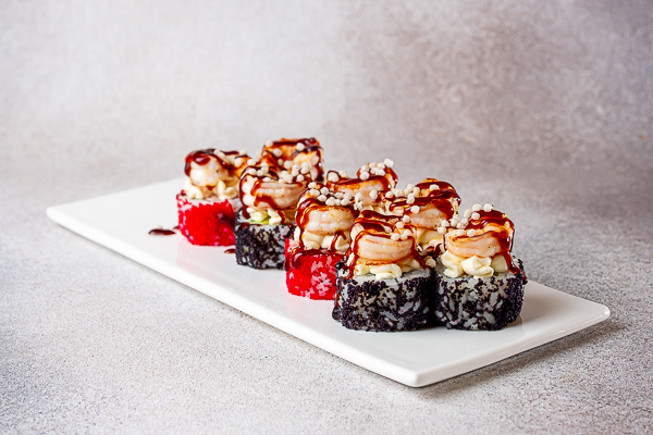 Тигрова креветка, тобіка червона,вершковий сир Філадельфія, помідор , шапочка, моцарелла, соус Том Ям, норі, рис.