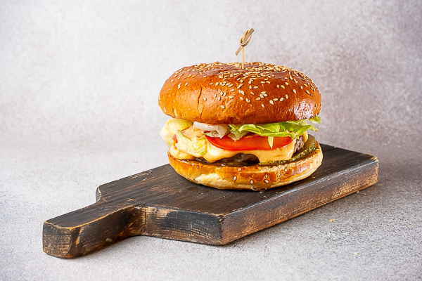 Смачна булочка, соковита котлета з телятини, соус сирний, салат айсберг, бочковий огірок, помідор, соус світ чілі, перець халапеньо 🌶️, соус гірчичний.