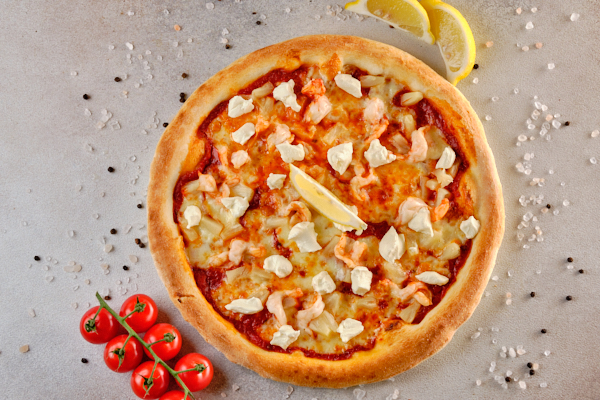 Соус з цільних томатів пелатті, моцарела, тигрові креветки, ананас, вершковий сир Філадельфія.