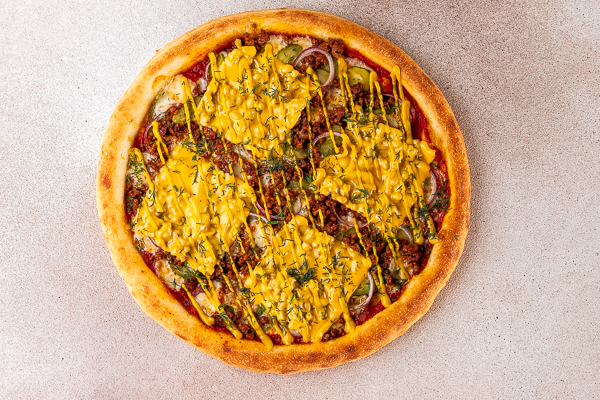 Соус з цільних томатів пелатті, моцарела, мелена телятина, чеддер, цибуля червона, огірок маринований, гірчиця американська.