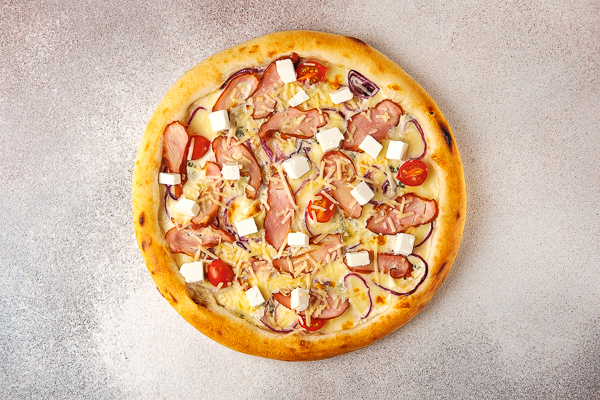 Моцарелла, вершковий соус, копчена курка, чері, цибуля синя, пармезан, дорблю, фета.