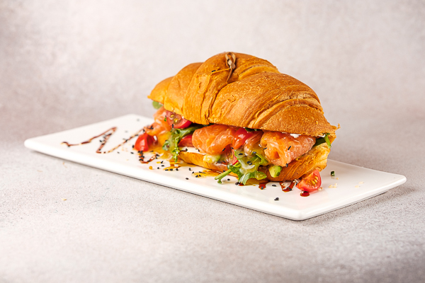 Круасан, вершковий сир, медово-гірчичний соус, чері, рукола, слабосолоний лосось, авокадо.