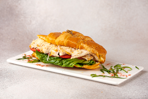 Круасан, куряче філе гриль, соус цезар, помідор, огірок, пармезан, рамен-салат.