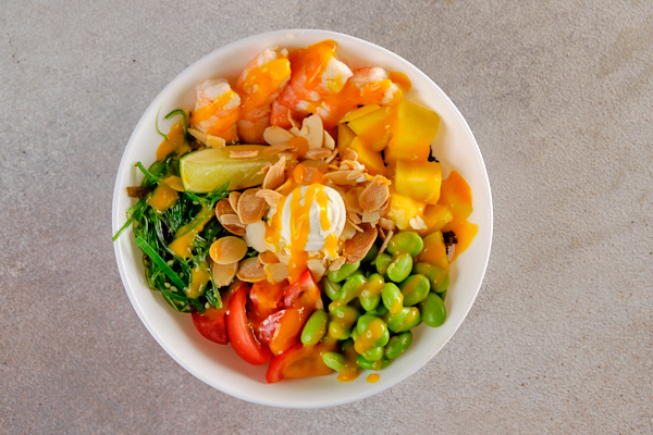 Рис, тигрові креветки, чука, вершковий сир Філадельфія, боби едамаме, манго, томати чері, соус манго, мигдалева стружка, кунжут, лайм, соус від шефа.