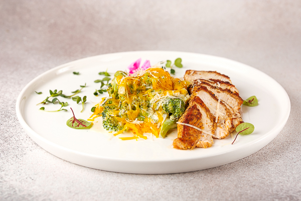 Броколі, індичка, вершковий соус, сир чеддер, пармезан, часник, тим’ян, біле вино.