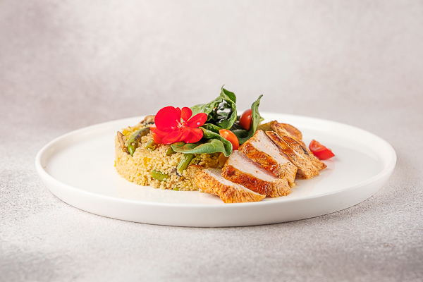 Кус кус, філе індички на грилі, цибуля, морква, печериці, стручкова квасоля, болгарський перець, шпинат, чері, вершкове масло, бульйон, тим’ян, розмарин.