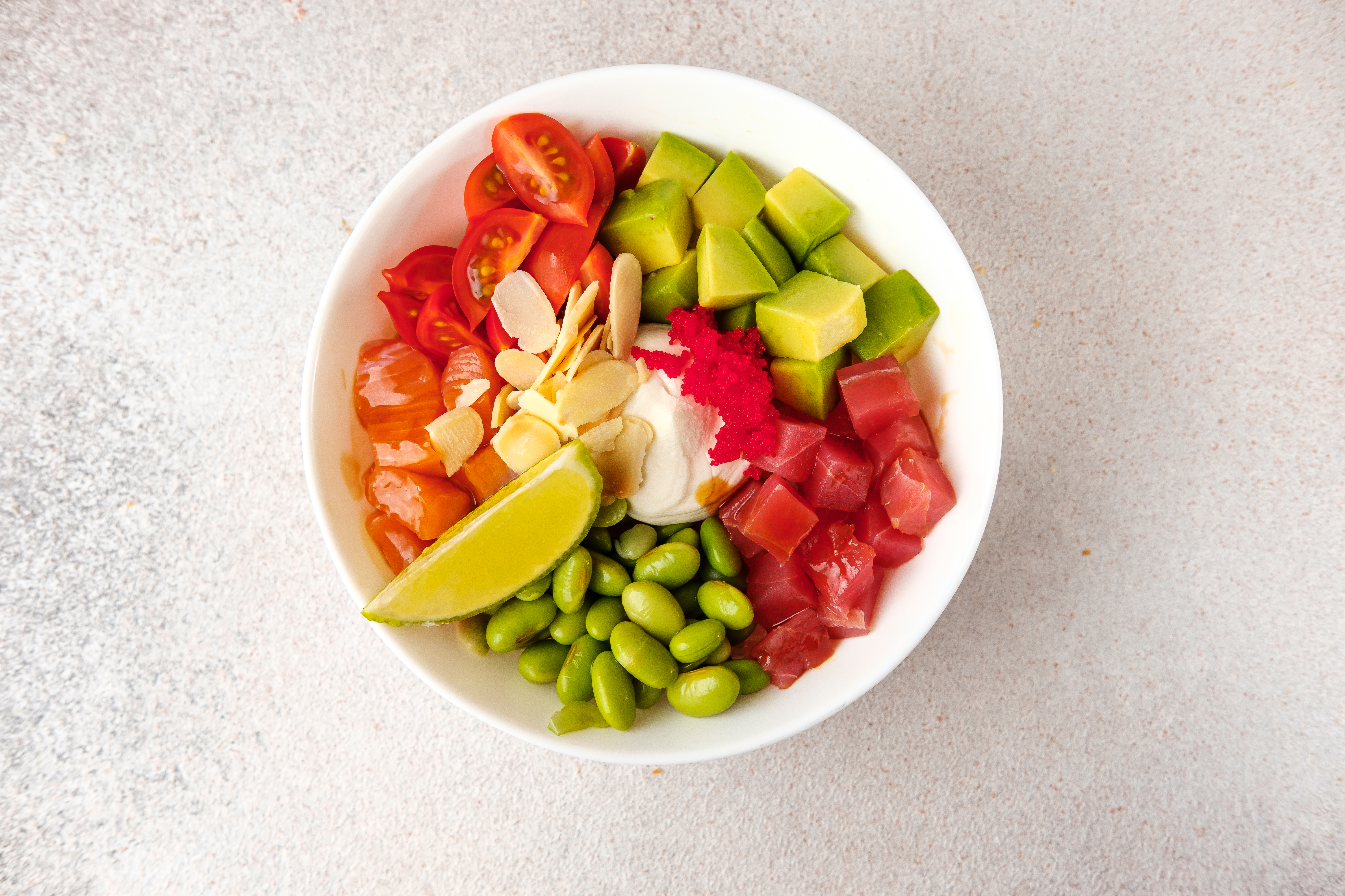 Рис, соус від шефа, авокадо, чері, боби едамаме, лосось, тунець, вершковий сир Філадельфія, тобіка червона, мигдалева стружка, лайм.